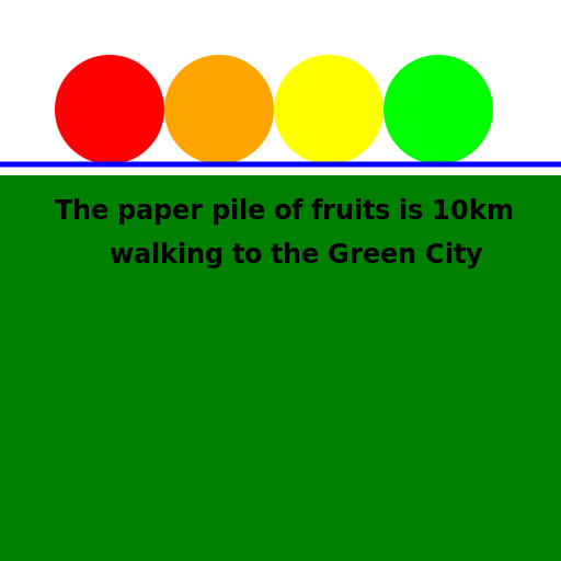 ctx.fillText('The paper pile of fruits is 10km', 50, 200);