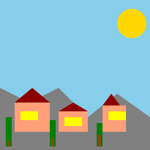 // I drew a picturesque mountain village with colorful houses, trees, and a sunny sky.