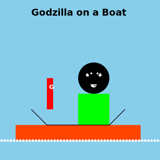 // "Godzilla just wanted a peaceful boat ride, but now he's making waves!"