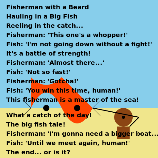 ctx.fillText("Fisherman: 'Gotcha!'", 20, 270); // Drawing the text