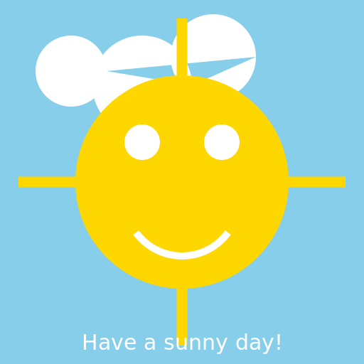 * Description: Drawing of a smiling sun in a blue sky with fluffy clouds.