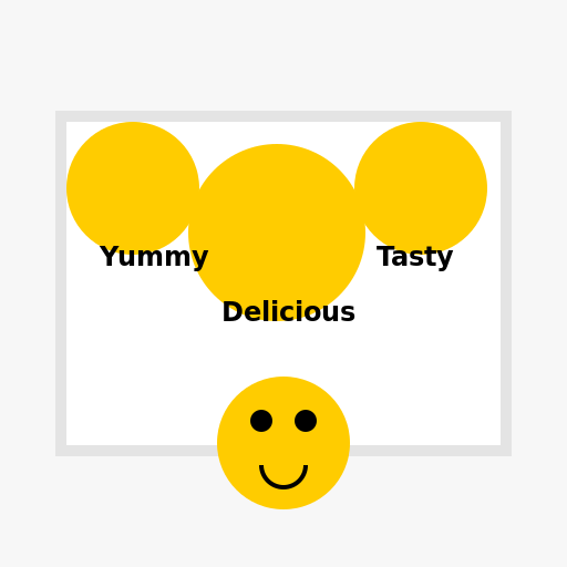 ctx.fillText("Tasty", 340, 240); // Writing label for the third food picture
