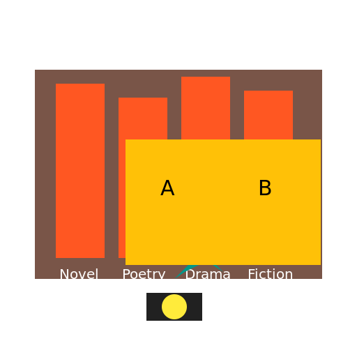 // Description: This vibrant drawing represents the magical world of literature. A bookshelf filled with books of different genres, such as novels, poetry, drama, and fiction, symbolizes the vastness and diversity of the literary realm. A quill pen with an ink pot signifies the timeless art of writing and storytelling. The paper sheets and letters scattered around evoke the joy of reading and the power of words. Step into this "Literature Wonderland" and let your imagination take flight!